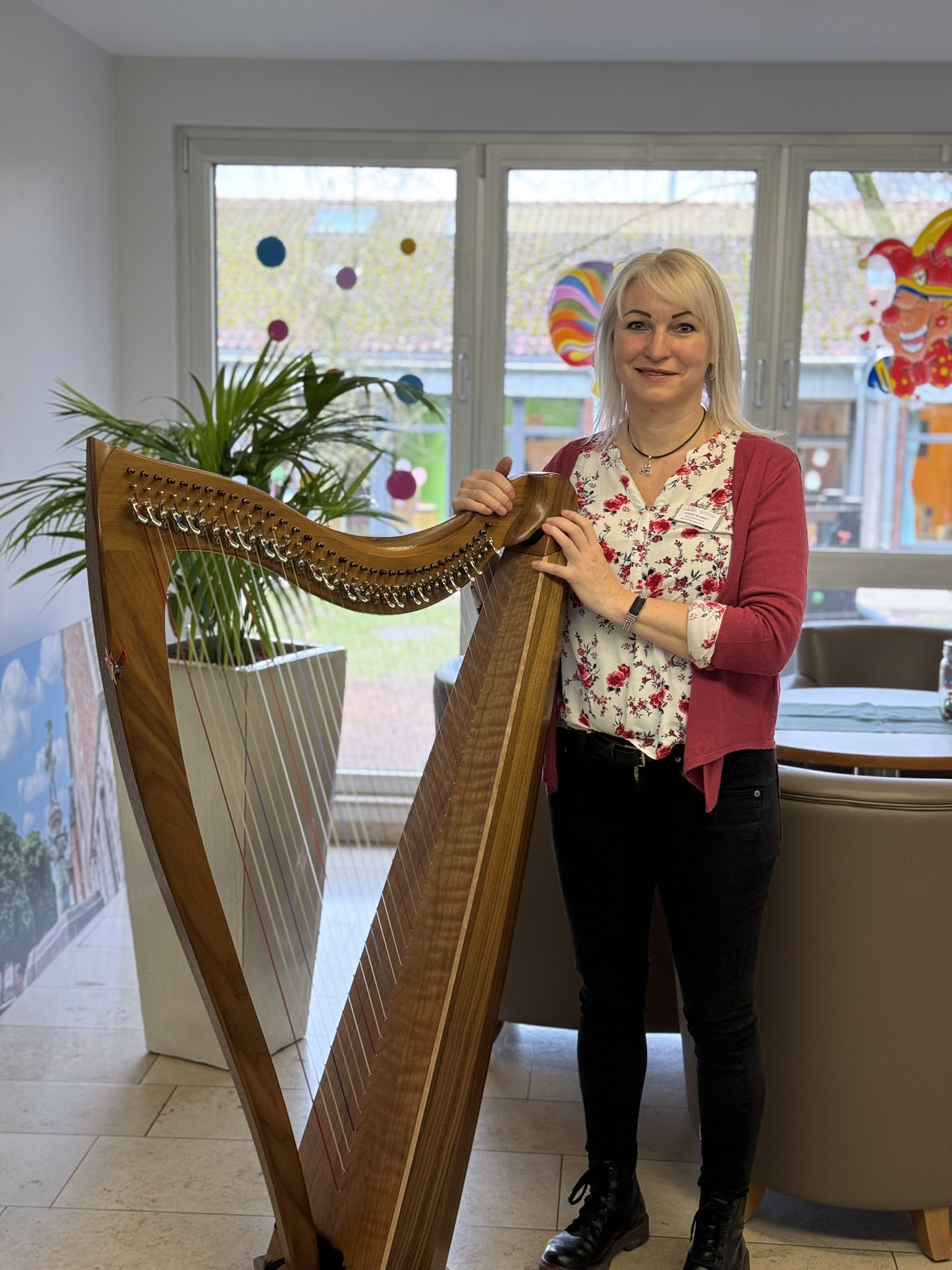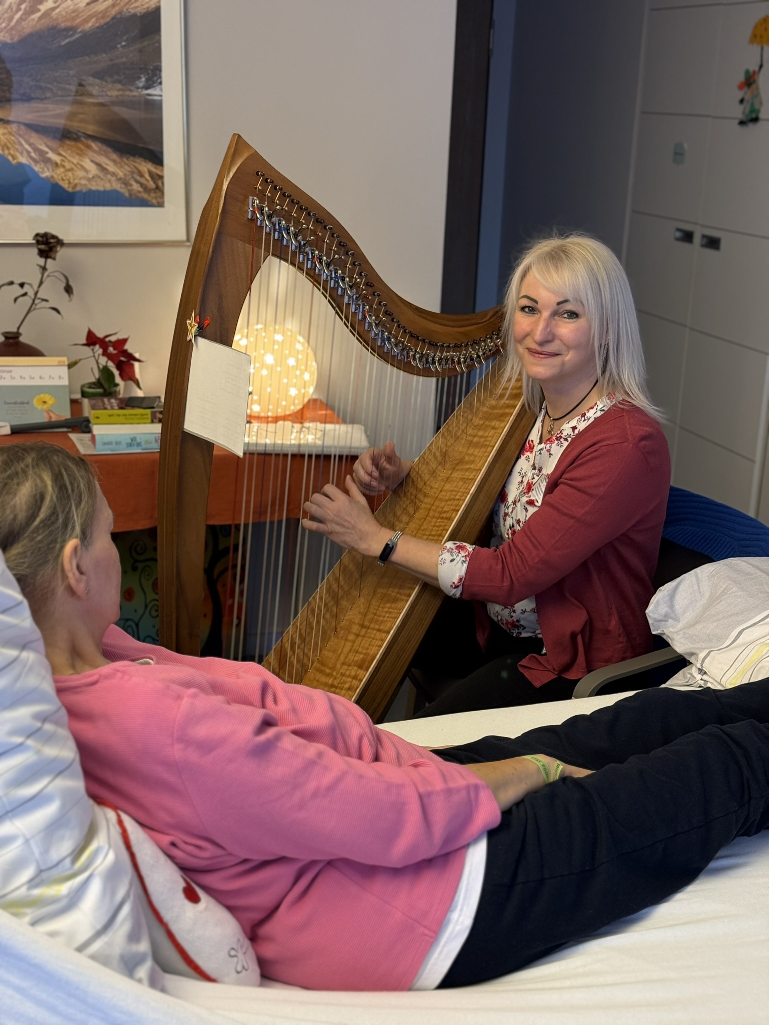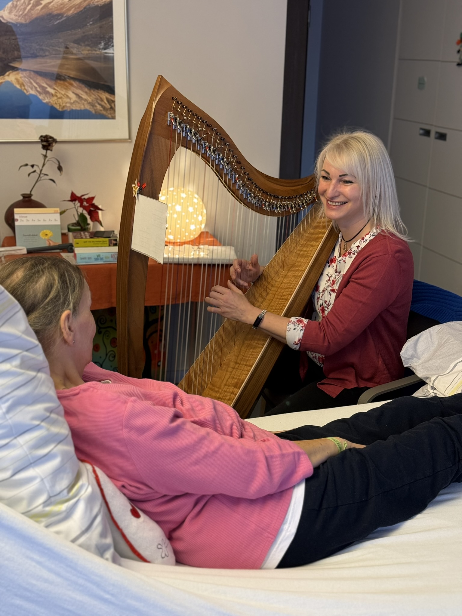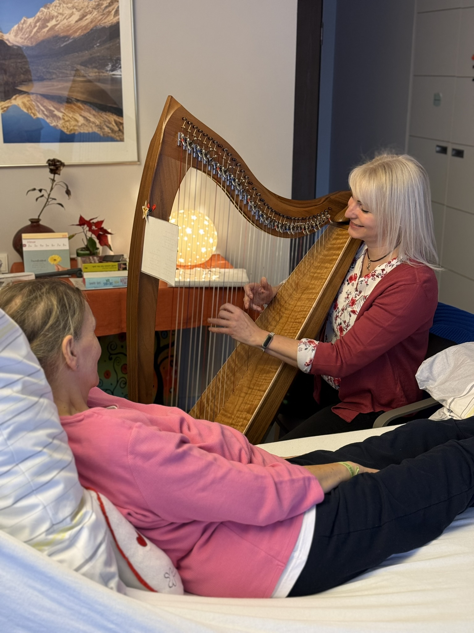 Sanfte musikalische Begleitung mit der Harfe bietet Yvonne Schmidt, Musik- und Harfentherapeutin i.A. 2025 bei uns im Hospiz alle 14 Tage donnerstags an. Mit beruhigende, wohltuenden Klängen eröffnet sie in der Einzelbegleitung einen tröstlichen Raum und die Möglichkeit zu entspannen und Momente innerer Ruhe zu genießen. Auch Klangmassagen sind möglich.