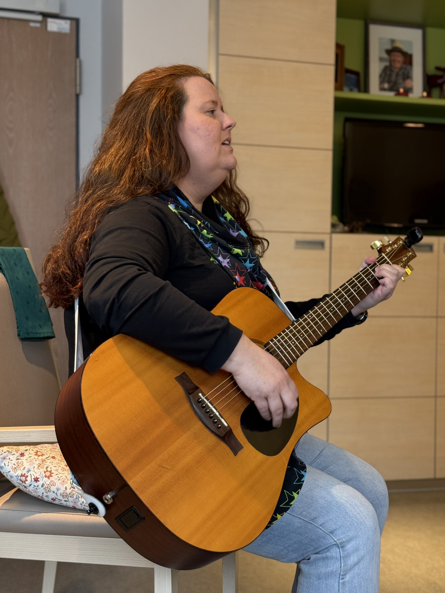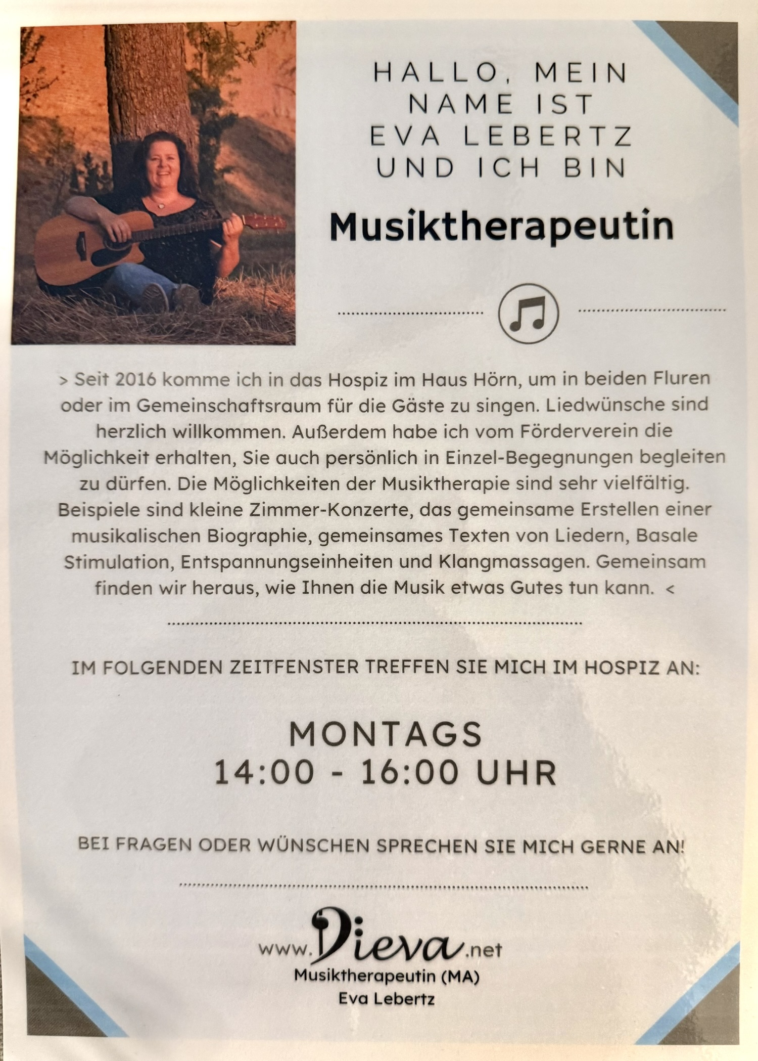 Musiktherapeutin Eva Lebertz kommt seit 2016 jede Woche Montag zu uns ins Hospiz. Sie singt für und mit den Gästen – begleitet durch Gitarre oder Klavier. Dabei sind Liedwünsche aller Art herzlich willkommen. Auch Einzelbegleitung im Zimmer ist möglich – das Erstellen einer musikalischen Biografie, Klangmassagen u.v.m. Hier finden Sie Bilder und einen Kurzfilm für einen Eindruck von ihrer Arbeit bei uns im Hospiz.